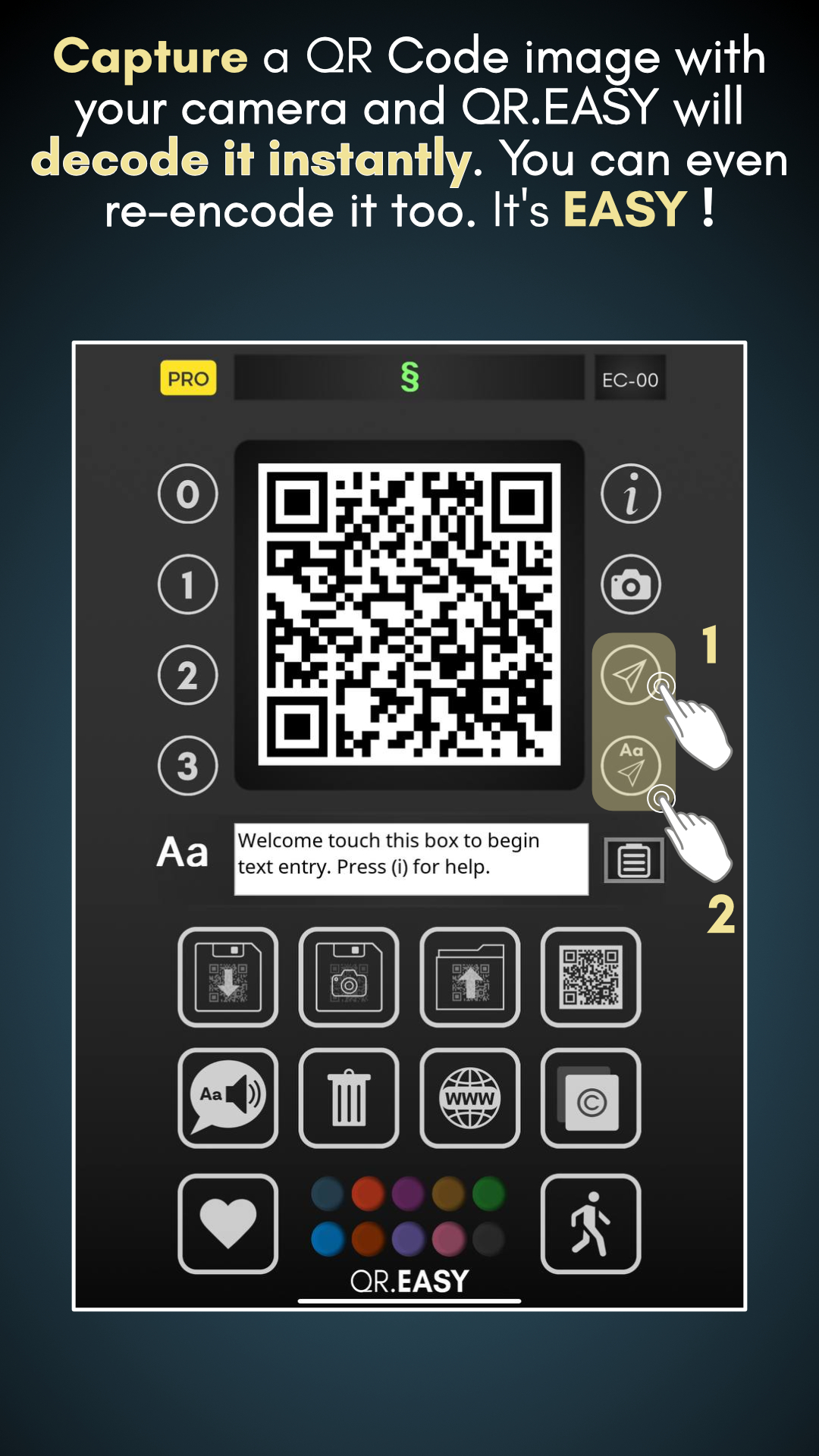 QR.EASY is a robust QR Code generation and detection application unlike any other application of its kind on the market today. With QR.EASY, you can easily capture QR Codes with your device's camera and decode them instantly, as well as create QR Codes from any text of your choice in 57 different supported languages and 4 different ‘Error Correction’ levels. If you already have a QR Code on your device ? You can upload that to the QR.EASY dashboard and decode it effortlessly.