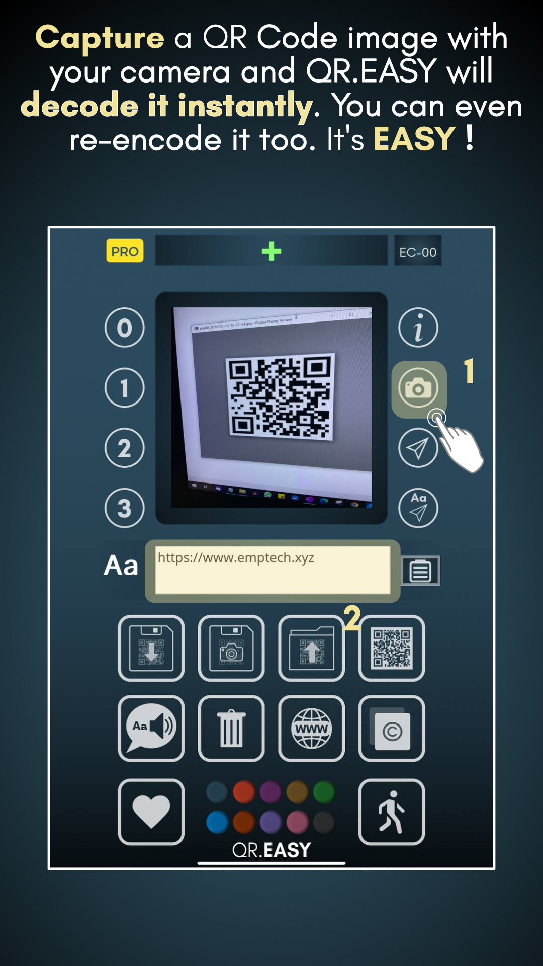 🔋 Re-Encoding: Did you know you can capture, decode, and then re-encode so easily with QR.EASY ? Once you capture a QR Code image with your camera, you can just press the ‘ENCODE’ button and it refactors the camera image into a clean QR Code image depending on the error correction level of your choice. The same applies to QR Codes uploaded from your device.